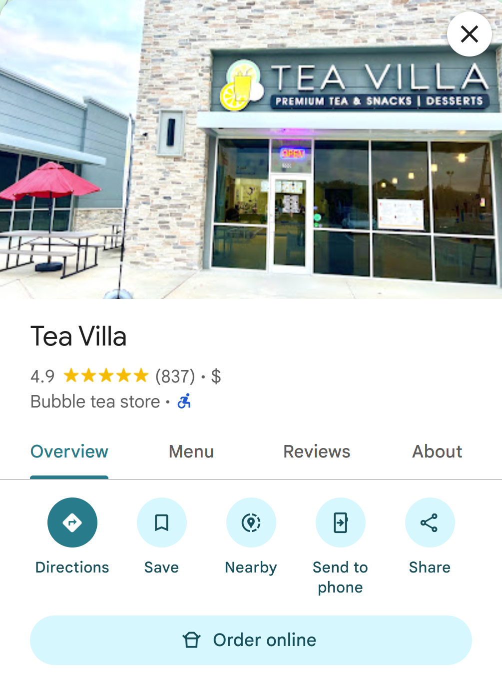 "Tea Villa offers a fresh menu with plenty of food and drink options. The space is clean, roomy, and family-friendly, and both my honey green tea and white peach green tea were made perfectly. This is now our go-to boba spot on Fry Rd!"